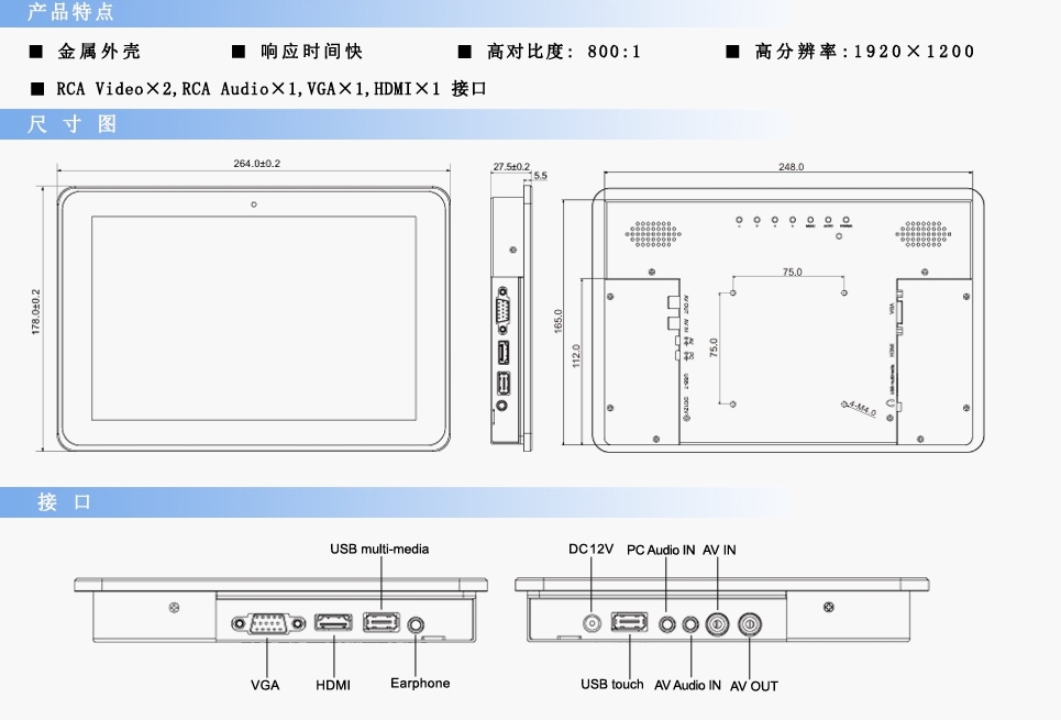 | 輸入接口 | RCA Video×2,RCA Audio×1,VGA×1,HDMI×1 | ||